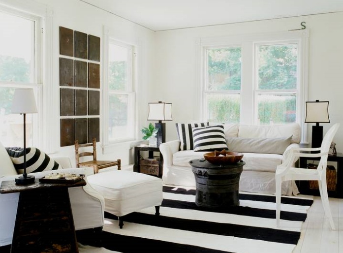 These powerful black and white stripes pack alot of punch, yet are balanced with simple white walls and 'naked' windows, making the space still seem airy and fresh.