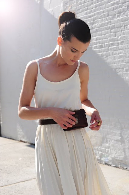 The stifling heat has had me longing for a cool summer breeze, I'm convinced that this light and airy ensemble would just attract one. Such a simple, fluid silhouette. All white, with a strong black accent. Hair swept up in a simple, chic chignon. Easy, breezy summer style.