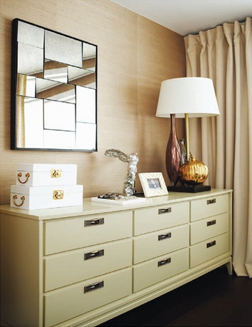 Graphic David Hicks fabric makes a bold statement in this neutral bedroom sanctuary. The look is calm and restful in earthy neutrals, but the textured grasscloth wallpaper and thick cream velvet curtains combined with metallic and mirrored accents add a sense of luxury and a hint of glamour.